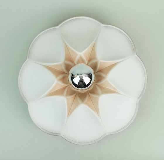 Bellissima montatura da incasso degli anni '80-'90 a forma di ninfea stilizzata. Adatto anche per il montaggio a parete. Produttore presumibilmente Pan-Keramik. L'effetto più bello si ottiene con una lampadina a specchio o qualsiasi altra lampadina con superficie strutturata. Per 1 lampadina E27 (la lampadina nelle immagini non è inclusa nel prezzo dell'articolo).