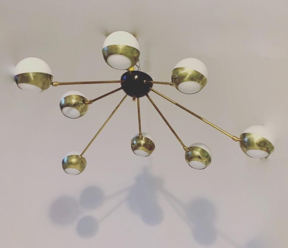 Plafoniera in ottone massiccio con 8 bracci e 8 globi opali su snodi sferici con diametro di 12 cm.