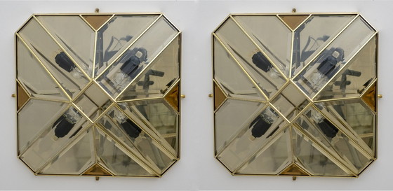 Queste lampade da parete sono state prodotte negli anni '70 in Italia, hanno una base quadrata e la forma di un parallelepipedo, la struttura è in ottone e i vetri sono smussati, questa lavorazione le rende uniche e illuminate hanno un effetto molto particolare.