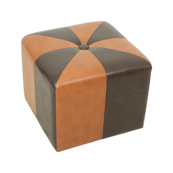 Grazioso pouf quadrato vintage in stile patchwork, realizzato con una base in legno e rivestito in pregiata ecopelle skai bicolore marrone e cammello, prodotto in Belgio intorno agli anni Sessanta.