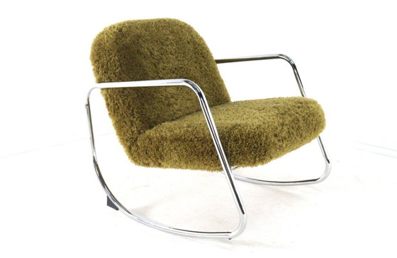 Questa sedia a dondolo ha un design minimalista e senza tempo, con un aspetto confortevole e invitante. L'elegante struttura in metallo cromato forma un'elegante linea continua che crea sia i braccioli che la base a dondolo. La seduta e lo schienale morbidi e generosi favoriscono una posizione di seduta rilassata e conferiscono alla sedia la sua caratteristica forma invitante.