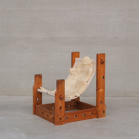 Poltrona a fionda spagnola in legno e tela della metà del secolo scorso