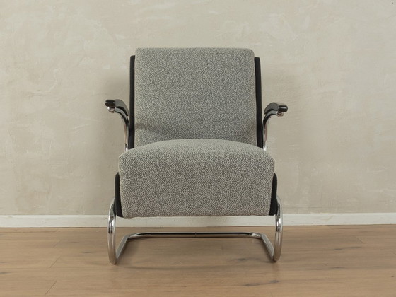 Rara poltrona Bauhaus di Mücke-Melder Werke degli anni '30, ispirata al design di Mart Stam, Marcel Breuer e Ludwig Mies van der Rohe. Telaio di alta qualità in tubo d'acciaio cromato con braccioli originali in legno laccato nero. Seduta e schienale sono stati rivestiti con un pregiato tessuto jacquard bianco e nero e un pregiato tessuto nero.