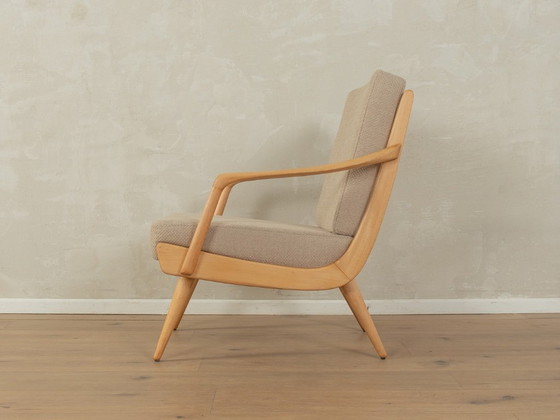 Splendida poltrona degli anni '50. Struttura in faggio di alta qualità. La poltrona è stata tappezzata e rivestita con un tessuto di alta qualità in beige. Ottima lavorazione, materiali di alta qualità, made in Germany.