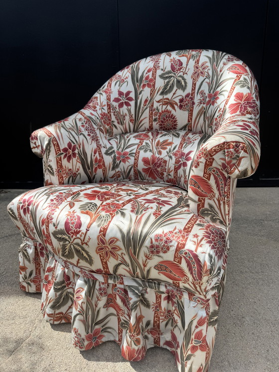 Affascinante poltrona antica a forma di fungo, completamente restaurata con imbottitura in crine di cavallo e rivestita in lussuoso raso floreale su sfondo bianco sporco/beige; ottime condizioni generali (con una leggera patina).