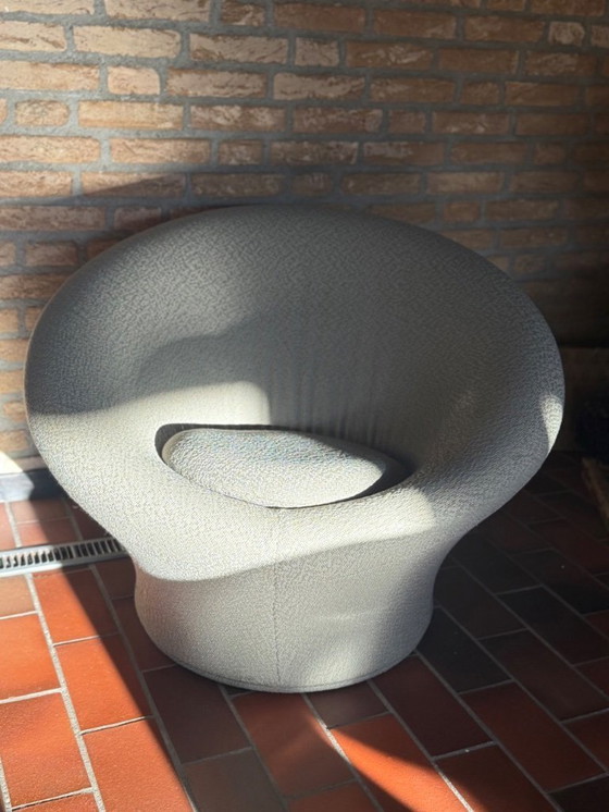 La poltrona Mushroom, disegnata da Pierre Paulin per Artifort nel 1960, è un classico iconico del design. Presenta una forma scultorea e organica, con una struttura completamente nascosta, e offre un comfort di seduta eccezionale. Questo esemplare è stato splendidamente rivestito dal suo precedente proprietario, conferendo al design un aspetto fresco e raffinato.
