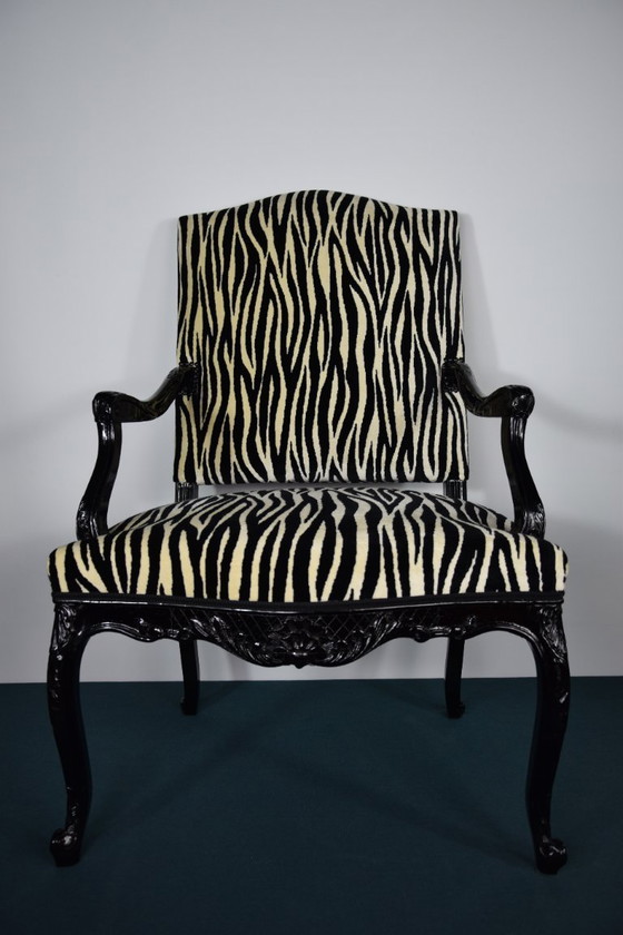 Elegante poltrona in stile Luigi XV con struttura in legno laccato nero lucido e sorprendente rivestimento in tessuto zebrato.