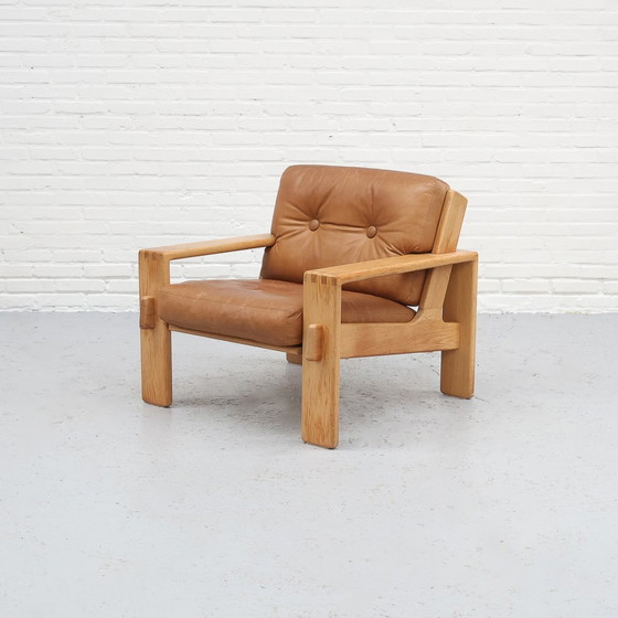 La poltrona "Bonanza" degli anni '60, disegnata da Esko Pajamies per Asko Finland. La sedia ha una splendida struttura in rovere patinato e un rivestimento in pelle color cognac, che crea un look caldo e senza tempo.