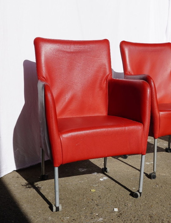 Poltrona in pelle rossa con comoda seduta e ruote. Era esposta in una concessionaria d'auto.