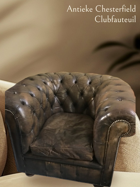Poltrona Chesterfield Club in pelle marrone vintage, con una patina e un aspetto splendidi. La poltrona è dotata di molle interne e il cuscino è reversibile.