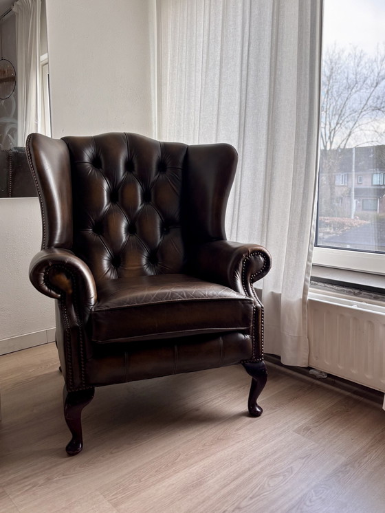 Poltrona Chesterfield vintage originale (1994), con certificato di autenticità. Questa poltrona ha un aspetto splendido e senza tempo ed è incredibilmente comoda. La pelle marrone e il caratteristico motivo a bottoni conferiscono alla poltrona un carattere forte e un aspetto classico. La seduta è profonda e comoda, con braccioli raffinati e robusti. Le gambe in legno completano magnificamente il look. Si adatta perfettamente sia ad interni classici che moderni.