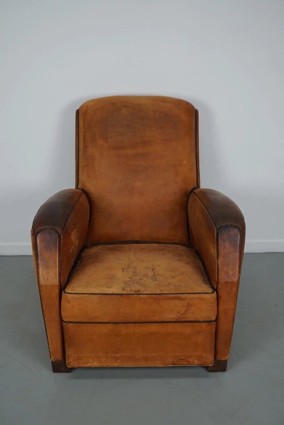 Poltrona da club vintage in pelle color cognac, Francia, anni '50
