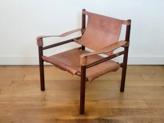 Poltrona Safari di Abel Gonzales, realizzata in Argentina alla fine degli anni '60, in cuoio e mogano. La poltrona presenta un rivestimento in cuoio con una splendida patina che le conferisce carattere. La struttura aperta in legno massello ha un design ben proporzionato. Linee rette e forme geometriche donano struttura e dinamismo al design. Un bel dettaglio è la cucitura a vista sul cuoio. La poltrona è in buone condizioni vintage con lievi segni d'uso. La seduta in cuoio necessita di riacquistare la sua forma originale, essendo stata conservata in soffitta per anni.