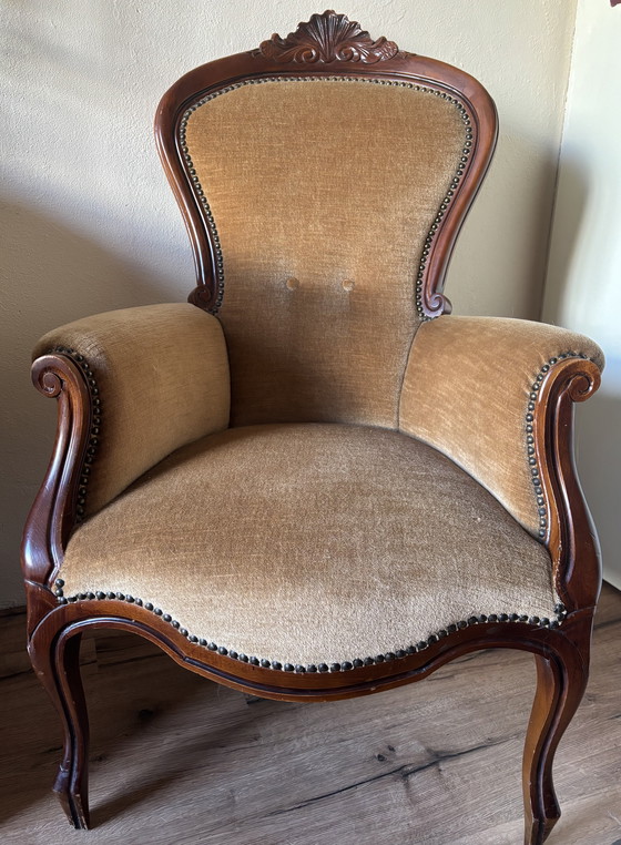 Splendida poltrona antica Luigi XV/rococò con elegante struttura in legno curvato, stemma/ornamento decorato nella parte superiore e splendida bordura a chiocciola lungo il rivestimento. La poltrona è robusta e si adatta con eleganza a qualsiasi ambiente, come soggiorno, camera da letto o angolo lettura.