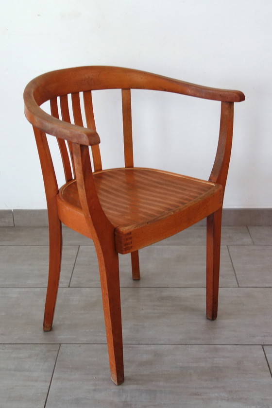 Questa poltrona da ufficio in stile FISCHEL, THONET degli anni '40 è comoda e straordinariamente elegante, con un'atmosfera da "Belle Époque". La sua forma a "lira" molto Art Déco e le curve morbide formate dallo schienale e dai braccioli conferiscono a questa poltrona retrò molto fascino ed equilibrio.
