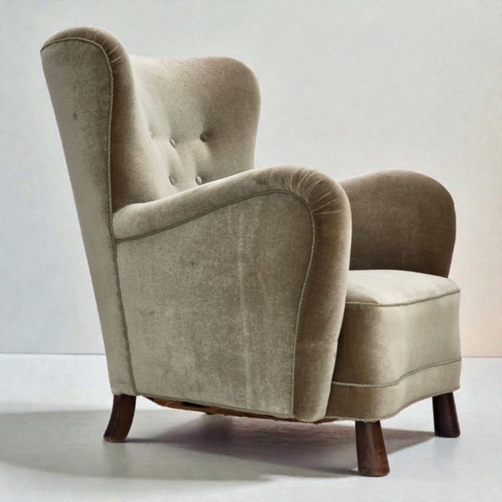 Poltrona danese, anni '60, rivestimento in velluto verde, gambe in legno di quercia.