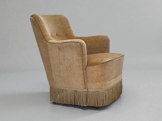 Poltrona danese degli anni '70. Rivestimento in velluto verde chiaro, seduta a molle, gambe in legno di faggio. Condizioni originali molto buone: nessun odore, nessuna macchia e struttura stabile. Prodotta da un produttore di mobili danese intorno agli anni '70-'75. Design vintage scandinavo originale proveniente direttamente dalla Danimarca. La sedia è stata controllata da un artigiano.