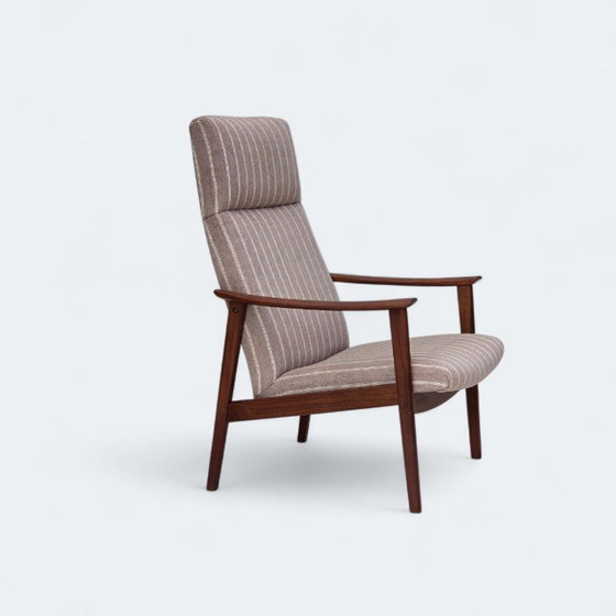 Poltrona danese con schienale alto, anni '70. Lana da arredamento originale marrone chiaro con strisce bianche. Legno di teak massiccio rinnovato. Condizioni originali molto buone: nessun odore, nessuna macchia e struttura stabile. Prodotta da un mobilificio danese negli anni 1970-75 circa. Design originale scandinavo vintage direttamente dalla Danimarca. La sedia è stata controllata da un artigiano.
