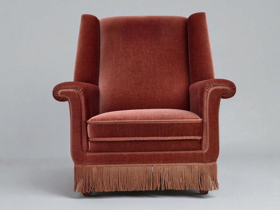 Poltrona danese con schienale alto, anni '70, rivestimento in velluto rosa salmone, legno di faggio.