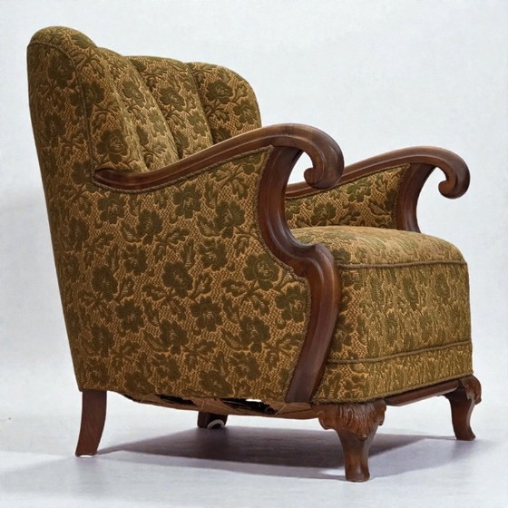 Poltrona danese degli anni '50. Lana verde per mobili, legno di quercia intagliato a mano, molle in ottone nella seduta. Buone condizioni originali: nessun odore, nessuna macchia e costruzione stabile. Tessuto leggermente usurato sulla seduta. Prodotta da un produttore di mobili danese intorno agli anni '55-'60. Design vintage scandinavo originale direttamente dalla Danimarca. La sedia è stata controllata da un artigiano.