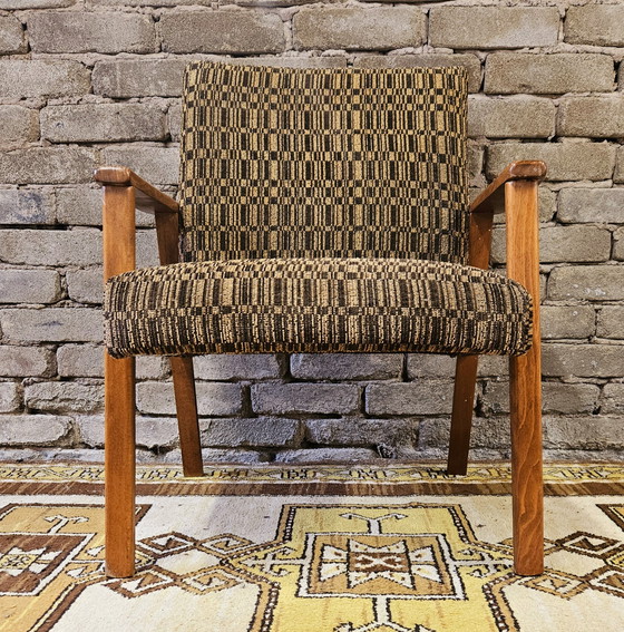 Poltrona danese degli anni '70. Struttura in legno massello di faggio, tessuto originale senza buchi o strappi, gambe posteriori inclinate. Buona seduta. Lievi segni di usura dovuti al tempo e all'uso.