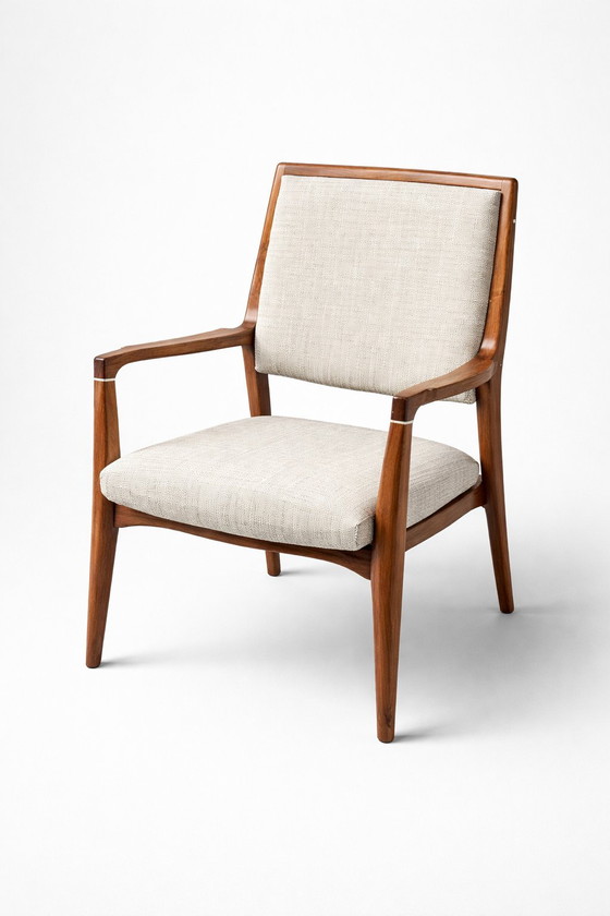 Immagina: un'elegante poltrona in stile anni '50 che dona immediatamente al tuo soggiorno un tocco retrò. Questa poltrona è stata rifoderata e risplende con la sua splendida struttura in legno e il rivestimento color crema.