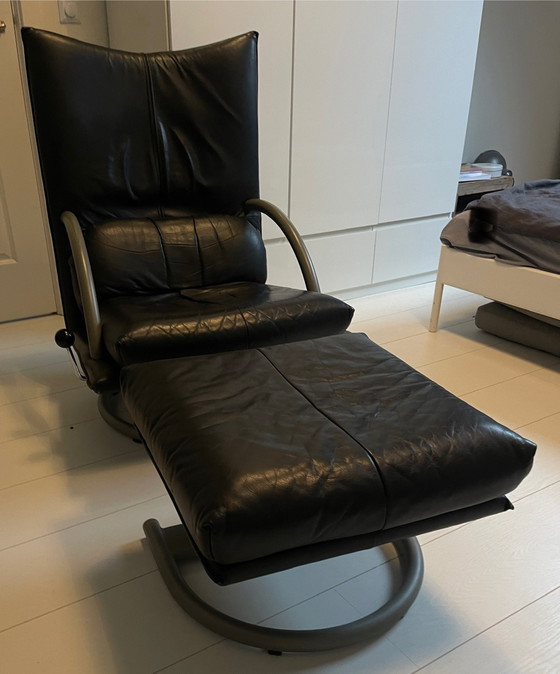 Poltrona e poggiapiedi Torino di Rolf Benz, in pelle nera.