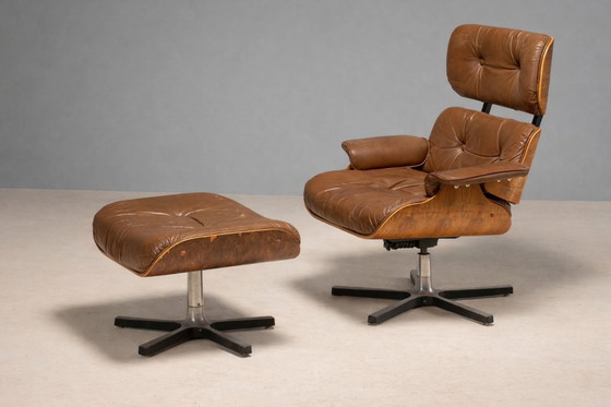 Il meccanismo girevole e reclinabile è funzionante, sebbene non sia stato restaurato o revisionato professionalmente. Nel complesso, il set conserva un aspetto vintage molto attraente e autentico. Peso stimato: Poltrona: 32 kg, Pouf: 12 kg (set completo: 45 kg)