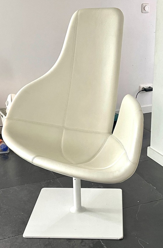 Questa versione specifica presenta una rara e minimalista combinazione "total white": pregiata e morbida pelle bianca su un'elegante base girevole verniciata a polvere bianca. Questo conferisce alla poltrona un aspetto arioso e sereno, perfetto per qualsiasi interno di lusso.