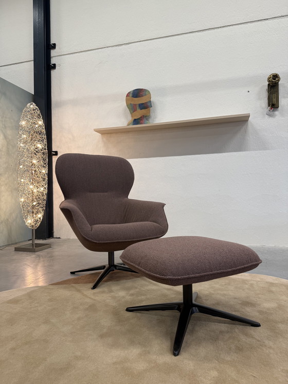 Nuova poltrona girevole Pode Flare con poggiapiedi, rivestita in tessuto.