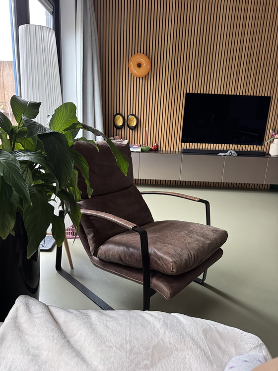 La poltrona Lex è una sedia ampia, perfetta per sprofondare. La struttura di questa poltrona è progettata in modo che la seduta sia praticamente sospesa. La seduta su cuscinetti, rivestita in pelle, ha un look vintage. La pelle color cognac, abbinata allo schienale in acciaio nero ben visibile, rende la poltrona perfetta per un interno industriale. L'imbottitura in piuma di alta qualità garantisce il massimo comfort. Goditi il tuo programma televisivo preferito sull'elegante poltrona Lex!