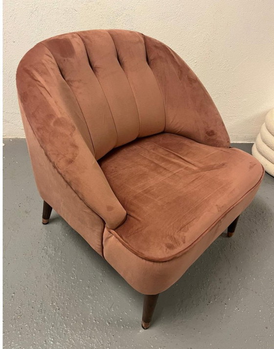 Una comoda sedia in velluto rosa con gambe effetto legno scuro. La sedia ha un aspetto lussuoso e caldo ed è molto comoda. È in condizioni quasi nuove.