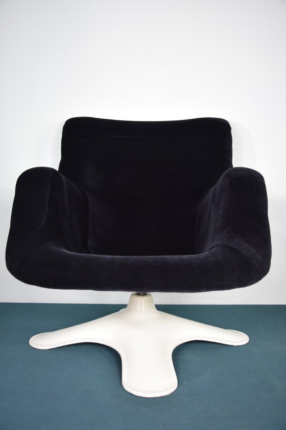 Un'iconica poltrona Karusselli di Yrjö Kakkapuro è stata sapientemente restaurata e rivestita in esclusiva con velluto mohair nero di alta qualità. Questa particolare versione è unica al mondo per la combinazione di materiali. Un classico del design unico nel suo genere, che offre un comfort eccezionale e un valore da collezione.