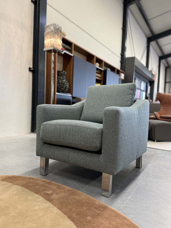 Nuova poltrona Leolux Antonia rivestita in tessuto Nomad di colore blu.