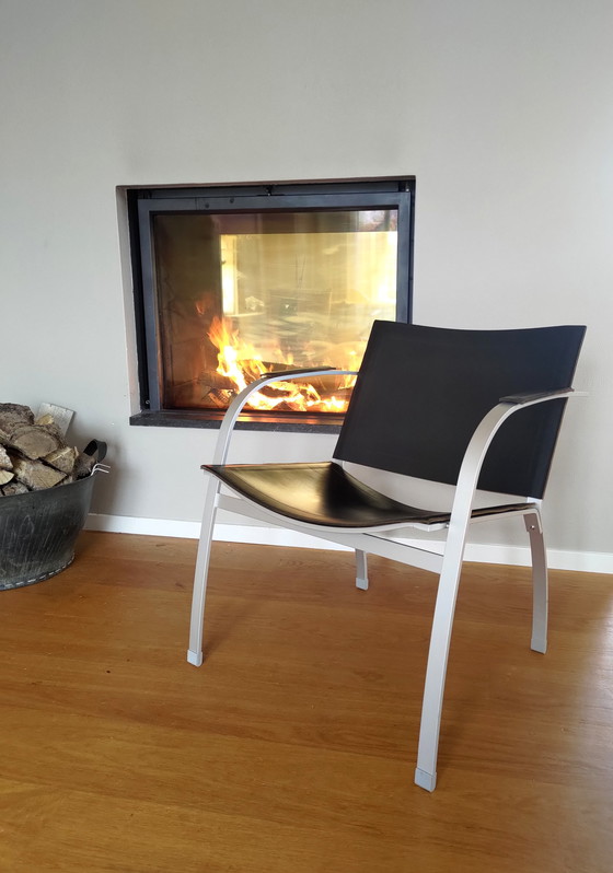 Poltrona "Stockholm" Telaio in alluminio, schienale e seduta in pelle nera Designer: Tord Björklund Periodo: anni '90 Produttore: Ikea Origine: Svezia Condizioni: ottime Dimensioni: 63,5 cm L x 70 cm A x 60 cm P Altezza seduta; 42 cm A