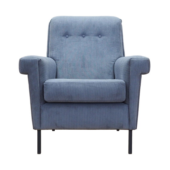 La poltrona è stata realizzata negli anni '70, manifattura italiana. Le gambe sono in metallo. La poltrona ha subito un restauro del rivestimento, il tessuto è stato sostituito con uno nuovo. Il rivestimento è stato realizzato in tessuto blu di alta qualità. Una seconda poltrona identica è disponibile nella nostra offerta: insieme creeranno un set unico. Condizioni: il tessuto è stato sostituito con uno nuovo, la struttura è in buone condizioni con normali segni d'uso. Sono visibili piccoli graffi e segni. I segni d'uso più estesi sono sempre visibili nelle foto. Prodotto pronto all'uso. Dimensioni: altezza: 91 cm, larghezza: 82 cm, profondità: 82 cm, altezza seduta: 44,5 cm, dimensioni seduta: 44,5 x 49 cm