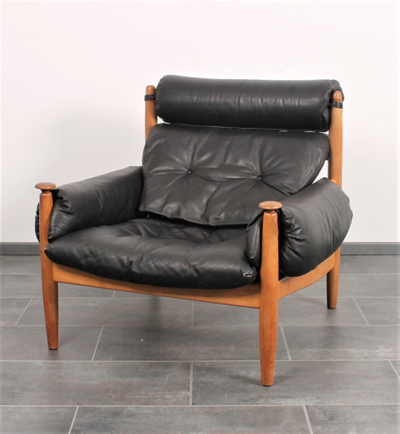 Una splendida sedia Amiral originale di Erik Merthen per Ire Mobler. La struttura in teak presenta splendide curve e i braccioli presentano il caratteristico pomello. I cuscini spessi e morbidi offrono un comfort di seduta perfetto. Le gambe presentano alcuni segni di usura. La pelle è in buone condizioni. Le sospensioni/i singoli sono stati sostituiti.