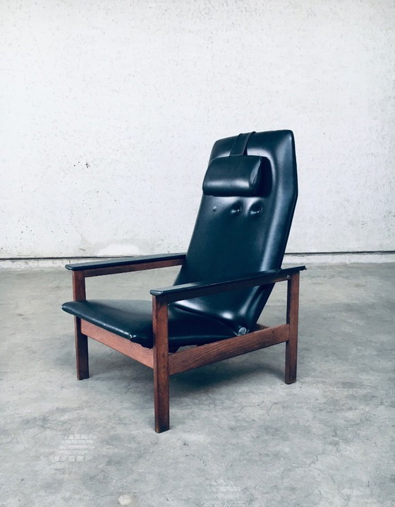 Poltrona relax vintage in stile Mid-Century Modern di Georges Van Rijck per Beaufort. Realizzata in Belgio, anni '60. Poltrona reclinabile con poggiatesta originale. Struttura in legno wengé con seduta e braccioli rivestiti in similpelle. La poltrona può essere regolata in 2 posizioni. Design molto bello ed elegante. In ottime condizioni originali. Manca un bottone con didascalia sul retro. Misure 96 cm x 69,5 cm x 84 cm.