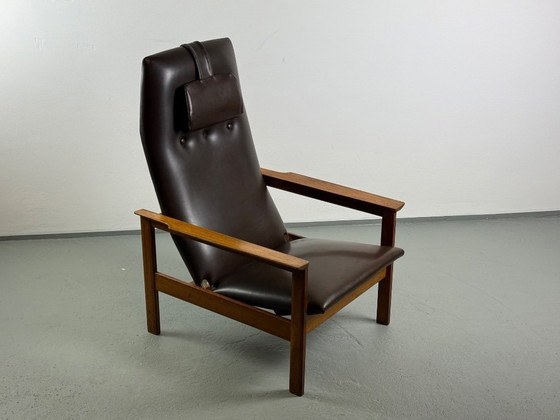 Rara poltrona reclinabile lounge disegnata da Georges Van Rijck per il marchio di arredamento belga Beaufort. La poltrona combina una robusta struttura in rovere con un rivestimento completo in similpelle marrone scuro. Le sue caratteristiche distintive sono lo schienale alto e leggermente svasato con poggiatesta integrato e tre bottoni decorativi. Lo schienale è regolabile tramite un meccanismo a cerniera color ottone sul lato, un dettaglio tecnicamente ed esteticamente elegante, caratteristico di questo modello.