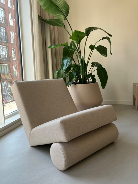 Questa è la poltrona Lean di STUDIO HENK. La poltrona è rivestita in tessuto Facet Naturel di colore chiaro e presenta un design moderno.