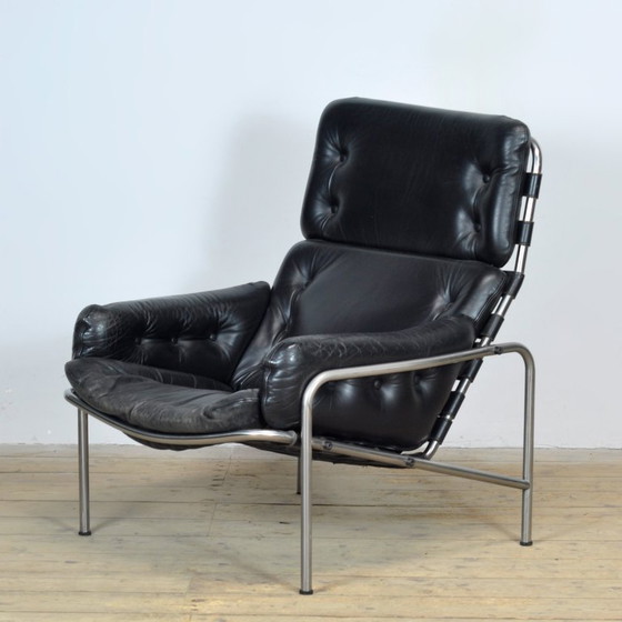 Progettata dall'iconico designer olandese Martin Visser per 't Spectrum, questa poltrona Nagoya SZ09 è un pezzo di design raro e senza tempo degli anni '60. La poltrona combina un'elegante struttura in acciaio cromato con un rivestimento in pelle nera, offrendo eleganza e comfort. I cuscini generosi e la caratteristica struttura a cinghie la rendono un vero e proprio elemento di spicco in qualsiasi ambiente. Ideale per gli amanti del design vintage e della storia del mobile olandese.