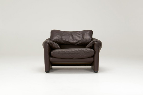 Poltrona 'Maralunga' con rivestimento in pelle marrone, disegnata da Vico Magistretti per Cassina negli anni '70.