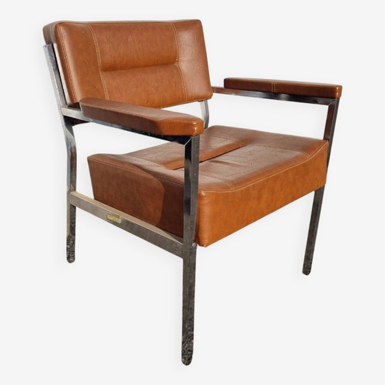 Poltrona degli anni '60, struttura cromata argento (da pulire) e Skaï color arancio, credo che il designer sia milord baughman. Ho anche una seconda poltrona con un piccolo strappo nel bracciolo da vendere.