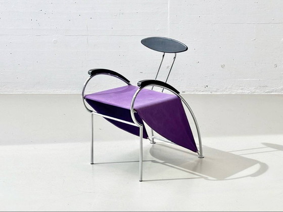 Lo schienale ovale è montato su due montanti angolari e sembra galleggiare. La seduta e le sezioni laterali sono realizzate in un ricco tessuto viola che si estende a ventaglio e conferisce al mobile leggerezza e dinamismo. Le forme ellittiche e i colori contrastanti sono esemplari dello stile idiosincratico e futuristico di Iosa Ghini, tra il Gruppo Memphis e l'estetica high-tech.