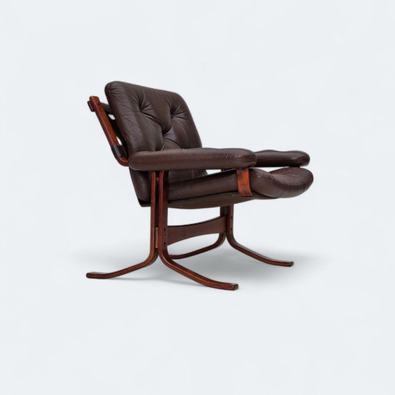 Poltrona norvegese degli anni '70 di Jon Hjortdal, pelle per mobili, legno curvato, tela.
