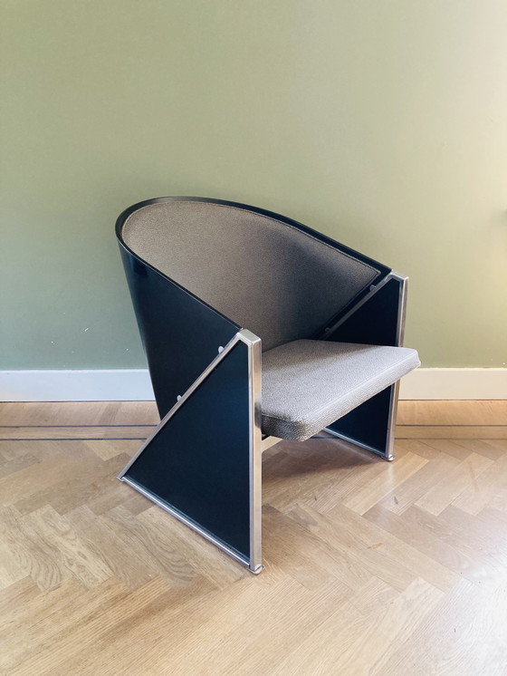 Questa poltrona finlandese INNO Mondi, disegnata da Jouko Järvisalo, è un pezzo moderno e sorprendente. Presenta un'elegante combinazione di colori nero e grigio, una robusta struttura in metallo e un comodo rivestimento in tessuto. Il design geometrico unico della poltrona la rende un'aggiunta di grande impatto a qualsiasi spazio abitativo moderno. Nonostante alcuni segni di usura, come graffi, ruggine e un piccolo foro nel tessuto, rimane un pezzo elegante e funzionale.