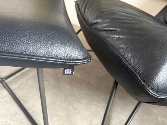 Poltrona Rolf Benz con pouf coordinato. Pelle nera. Cucitura invisibile tra seduta e schienale.