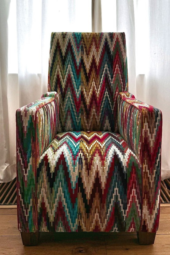Poltrona su misura, condizioni da esposizione. Questa poltrona faceva parte dell'esposizione nel nostro showroom ed è in buone condizioni. Una fantastica opportunità per possedere un pezzo su misura a un ottimo prezzo. Trasforma il tuo spazio abitativo con questa poltrona su misura, caratterizzata da un audace e colorato motivo a zigzag in velluto tagliato, che trasuda energia e creatività. Il rivestimento vivace si abbina a una silhouette elegante e strutturata, rendendola un pezzo unico per qualsiasi ambiente. Progettata per offrire comfort e durata, questa poltrona è tanto funzionale quanto esteticamente accattivante.