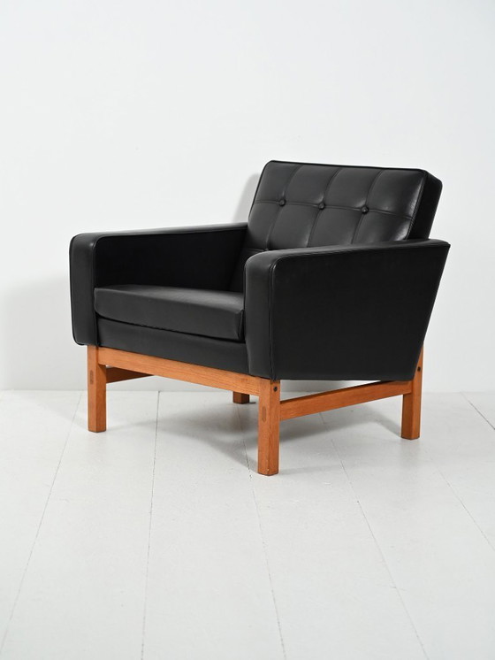 Poltrona svedese anni '60-'70 in similpelle nera con gambe in teak, geometria netta e braccioli avvolgenti.
