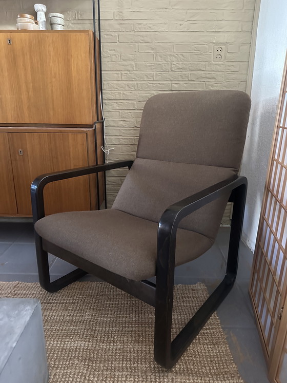 Immergiti nell'eleganza degli anni '80 con questa poltrona vintage Wildkahn. Il suo design senza tempo e il rivestimento in tessuto marrone intenso le conferiscono un aspetto caldo e accogliente, perfetto per qualsiasi ambiente sofisticato. La robusta struttura in legno, rifinita in un elegante nero, completa l'estetica generale della poltrona, rendendola un'aggiunta versatile sia per interni moderni che classici.
